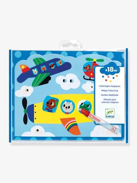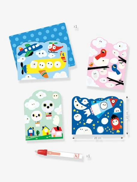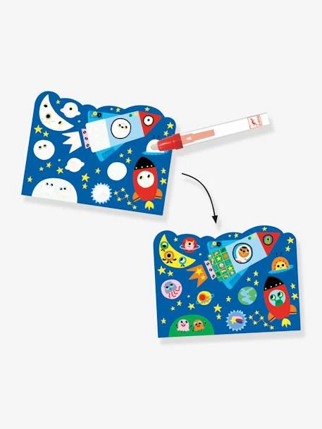Magique ! Les couleurs se révèlent en passant simplement le stylo à eau sur les 4 planches illustrées du coffret Caché dans le ciel de DJECO ! Faites sécher et recommencez !