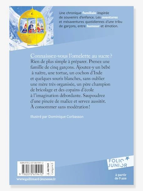 Connaissez-vous l’omelette au sucre ? Rien de moins compliquĂ© Ă prĂ©parer. Prenez une famille de cinq garçons. Ajoutez-y un nouveau bĂ©bĂ© Ă naĂ®tre, une tortue, un cochon d’Inde et une poignĂ©e de souris blanches. MĂ©langez bien le tout, sans oublier une mère très organisĂ©e, un père champion du bricolage et quelques copains d’Ă©cole Ă l’imagination dĂ©bordante. Saupoudrez d’une pincĂ©e de malice et d’Ă©motion, et servez aussitĂ´t. C’est prĂŞt… Ă€ consommer sans modĂ©ration !