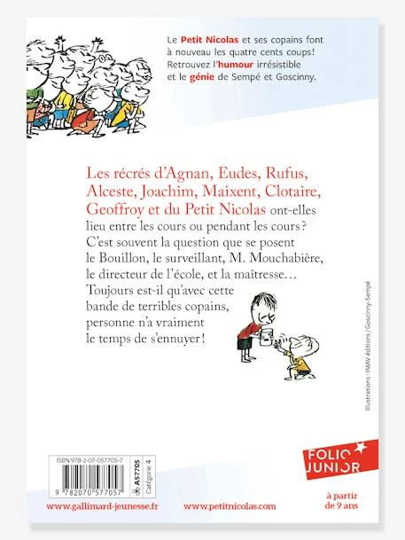 L’école, c’est pour les copains. Pour cette raison évidente, Nicolas aime beaucoup l’école, surtout pendant les récrés. Mais les récrés d’Agnan, Eudes, Alceste, Joachim, Maixent, Rufus, Clotaire, Geoffroy et du petit Nicolas ont-elles lieu entre les cours ou pendant les cours ? C’est souvent la question que se posent le Bouillon, le surveillant, le directeur et la maîtresse… Avec cette bande de terribles copains, personne n’a vraiment le temps de s’ennuyer !