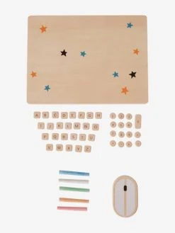 - Contient : 1 ordinateur en bois avec écran et clavier ardoise, des lettres magnétiques repositionnables, des craies et 1 souris effaceur