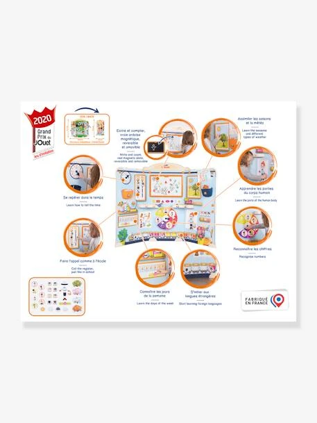 Ils pourront retrouver de nombreuses caractĂ©ristiques prĂ©sentes dans les salles de classe : ardoise (blanche magnĂ©tique ou surface craie), horloge pour indiquer et apprendre l’heure, cartes personnalisables pour Ă©tablir la liste des Ă©lèves prĂ©sents et absents, frise pour se repĂ©rer dans l’espace, roue pour apprendre les chiffres/les activitĂ©s journalières/les couleurs, train des anniversaires, arbre Ă mĂ©tĂ©o, cartes pour apprendre les parties du corps, …